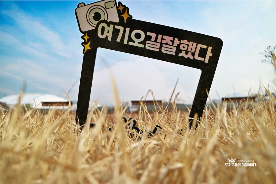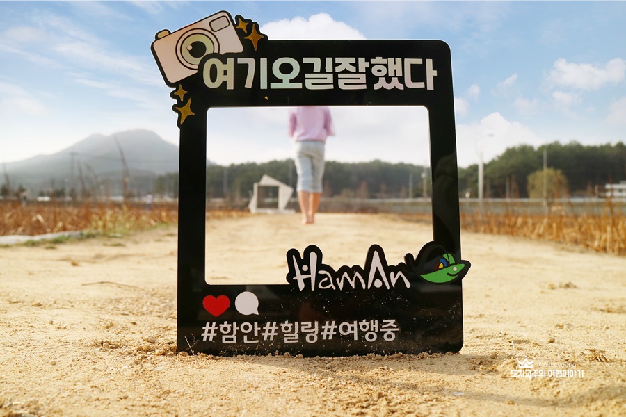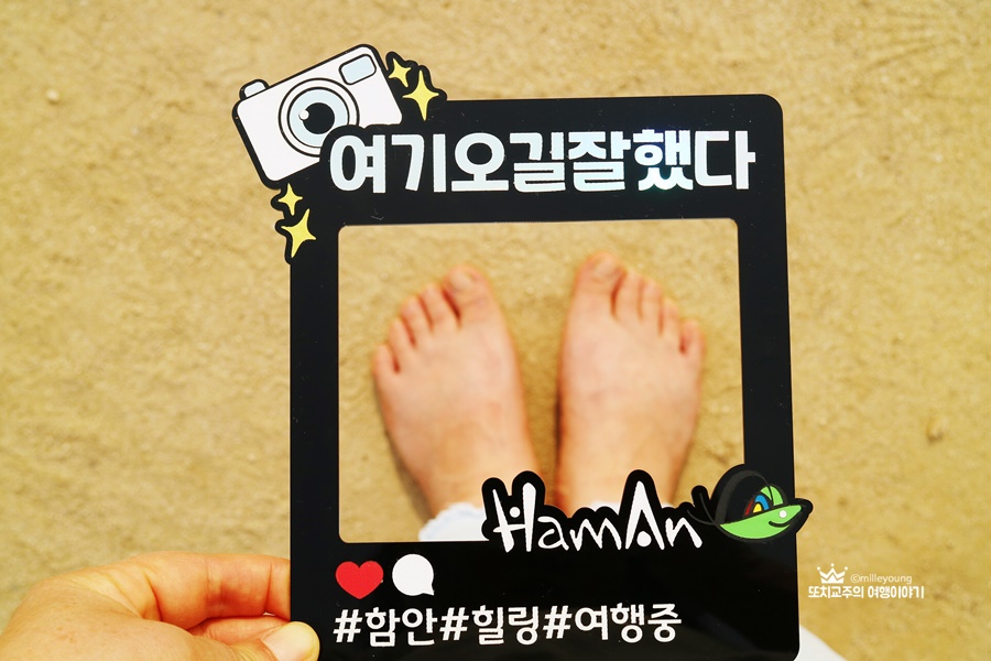 함안군청에서 보내준 토퍼~ 의외로 느낌이 좋아 맨발걷기 하며 사진도 찍으며 나만의 힐링시간을 가졌다. 이 사진을 찍기 위해 최대한 몸을 숙였는데 덕분에 운동도 했다.