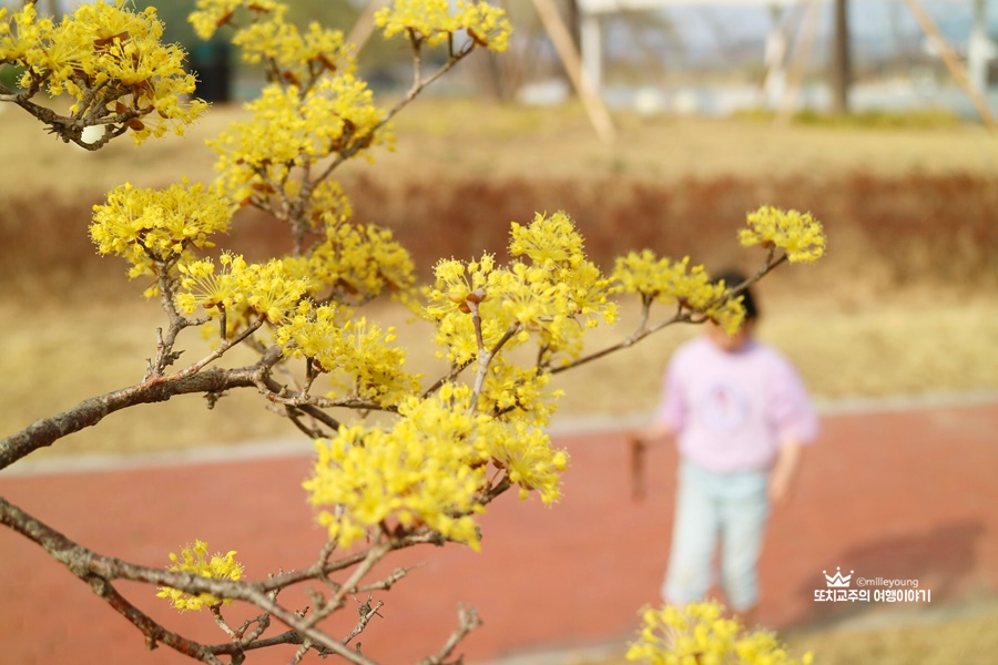 꽃 피던 3월 함안연꽃테마파크에는 산수유도 활짝 피었었다. 화장실 옆 쪽에 산수유 몇 그루가 활짝 피었었다. 사진을 찍기 위해 맨발로 잔디밭을 걸었는데 뾰족뾰족한 느낌이 깜짝 놀랐다. 그래도 사진 찍기 좋아하는 모녀는 이 아픔도 잊은 채 산수유 사진을 카메라에 담기 바빴다.