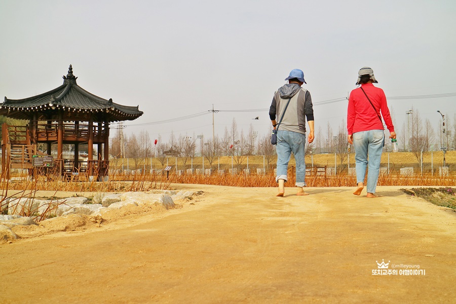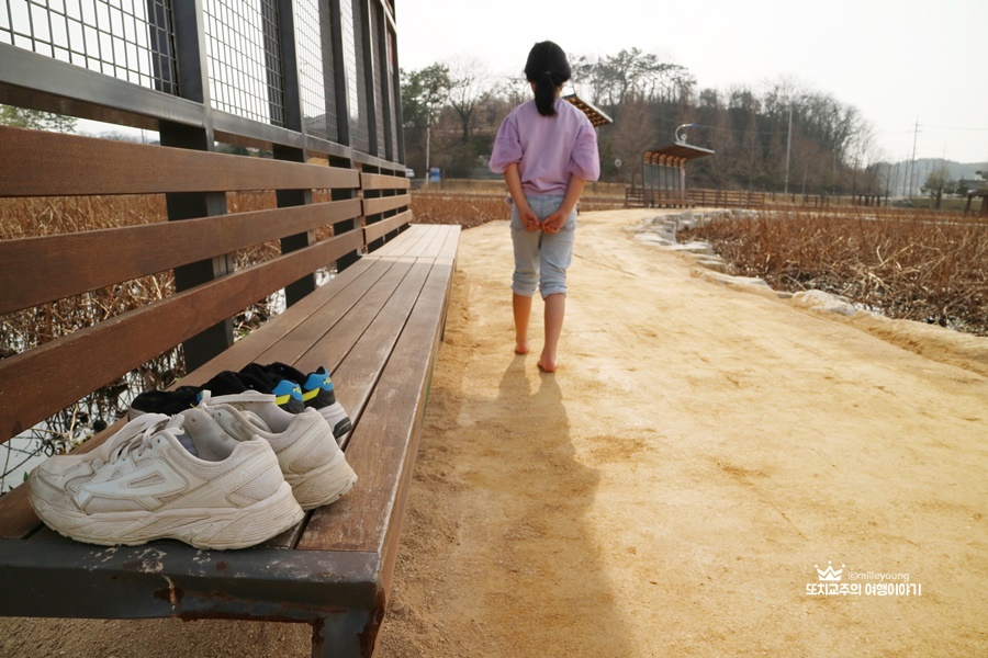 경남에서 맨발걷기 좋은 함안연꽃테마파크에서 아이와 함께 맨발 걷기를 했다. 봄이 오니 뽀송뽀송한 흙길을 맨발로 걸으니 기분이 좋다. 개인적으로는 지압을 좋아하는 편이라 맨발걷기 할 때는 자갈이 좀 있는 곳을 선호한다. 가끔씩 온몸을 찌르는 자갈이 내 몸을 자극할 때의 그 고통이란 의외로 중독성 있다.